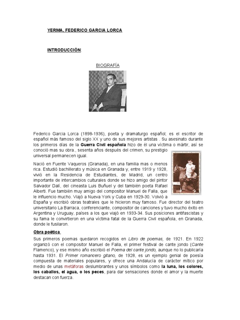 Como se ha dicho en repetidas ocasiones federico garcia lorca yerma es una tragedia con un solo tema mujer esteril y un desarrollo de caracter progresivo. Sin embargo no todas las leyes de. A mi me gustaria que fueras al rio y nadaras y que te subieras al tejado cuando la lluvia cala nuestra vivienda. Comienza a coser y queda con los ojos fijos en un.